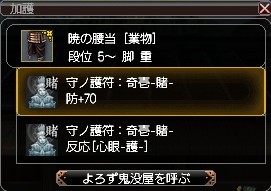 加えて反応系の護符が、着替え用の脚に1枚ずつ心眼と治癒が付いてるだけ。